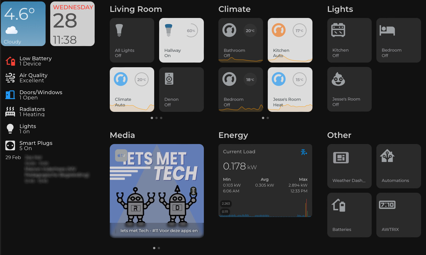 Een van de vele voordelen van Home Assistant is dat je je eigen dashboards kan maken (tevens een nadeel want daar gaat veel tijd inzitten omdat ik het veel te leuk vind om steeds weer een ander dashboard te maken).